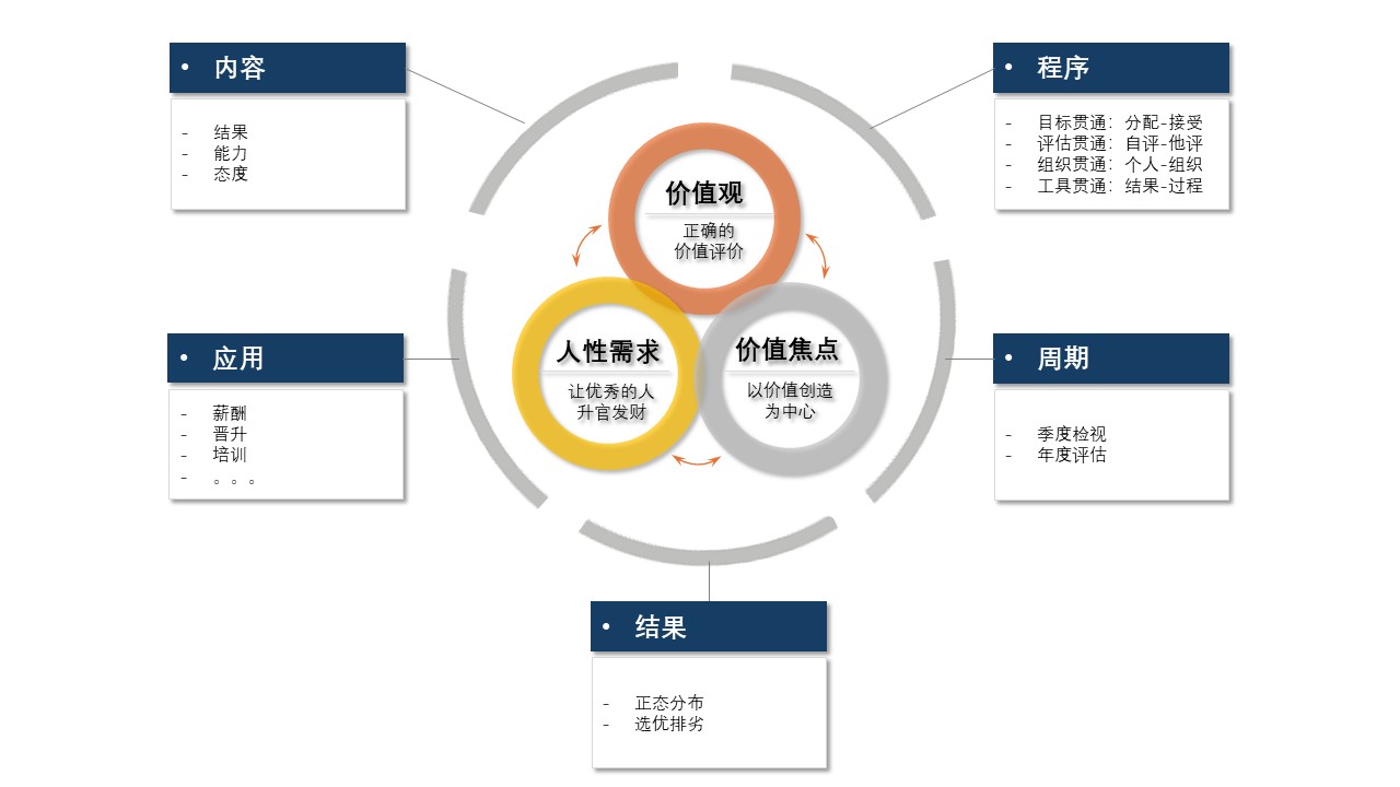 (1)价值观。价值观决定了企业能否做出正确的价值评价, 有什么样的价值观就会有什么样的考核,不论你的企业是否已经明确的提炼出了价值观。比如有的企业提倡“诚信、共赢”,但在考核上唯收入是从,只要搞到钱就可以;在分配上,员工连真实的数据都看不到,那这种考核只能是把企业考散。所以,价值观是核心,我们必须要探究、明确考核背后的价值观!